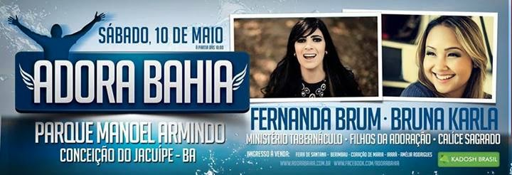 O Adora Bahia 2014 de Conceição do Jacuípe, será realizado no dia 10 de maio no Parque Manoel Armindo. No evento está previsto milhares de pessoas que vão adorar o nome do Senhor Jesus, com grandes nomes da música como: Fernanda Brum, Bruna Karla, Ministério Tabernáculo, Filhos da Adoração, Ministério Cálice Sagrado, entre outros.