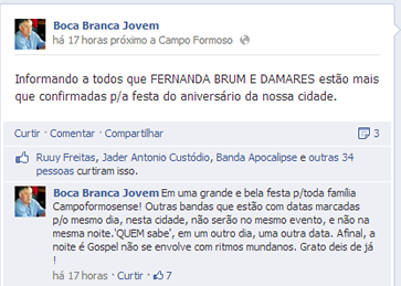 Após muitas perguntas e duvidas em relação a programação do Aniversário da cidade de Campo Formoso, os organizadores confirmaram pela rede social Facebook, que Damares e Fernanda Brum estarão sim dia 28 de julho, próximo domingo na cidade participando do evento.