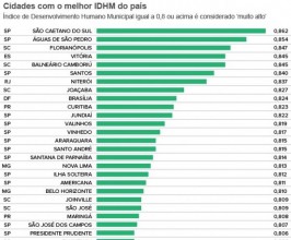 O Índice de Desenvolvimento Humano Municipal (IDHM) do Brasil cresceu 47,5% entre 1991 e 2010, segundo o “Atlas do Desenvolvimento Humano no Brasil 2013”, divulgado nesta segunda-feira (29) pelo Programa das Nações Unidas para o Desenvolvimento (Pnud). De acordo com a publicação, a cidade com o IDHM mais elevado é São Caetano (SP), e os municípios que tiveram maior evolução no quesito “renda” são das regiões Norte e Nordeste.