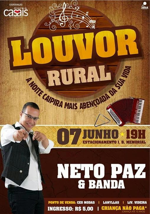 O Louvor Rural 2014 de Ilhéus, será no dia 07 de junho de 2014 as 19h. Um evento realizado pelo ministério de casais da IBMI Igreja Batista Memorial de Ilhéus, contará com a participação do forrozeiro de Jesus o Cantor Neto Paz e Banda.