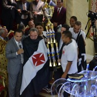 Os ajudantes de Malafaia levaram ao altar uma bandeira do time, camiseta e até mesmo um troféu exclusivo chamando o pastor Abner de vascaíno.